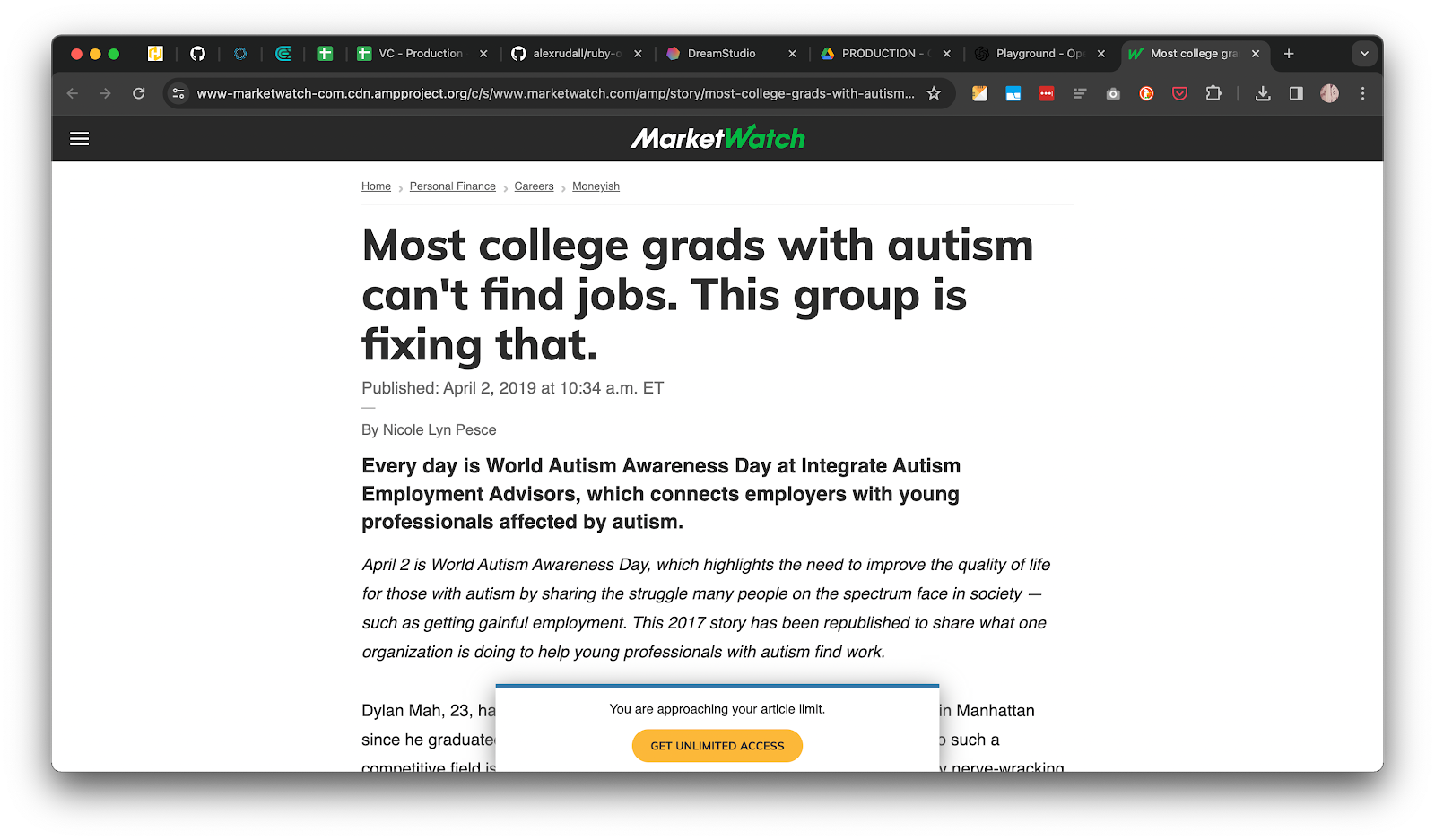 A friend sent me this article: Pesce, N. L. (2019, April 2). Most college grads with autism can’t find jobs. This group is fixing that. MarketWatch. https://www.marketwatch.com/amp/story/most-college-grads-with-autism-cant-find-jobs-this-group-is-fixing-that-2017-04-10-5881421